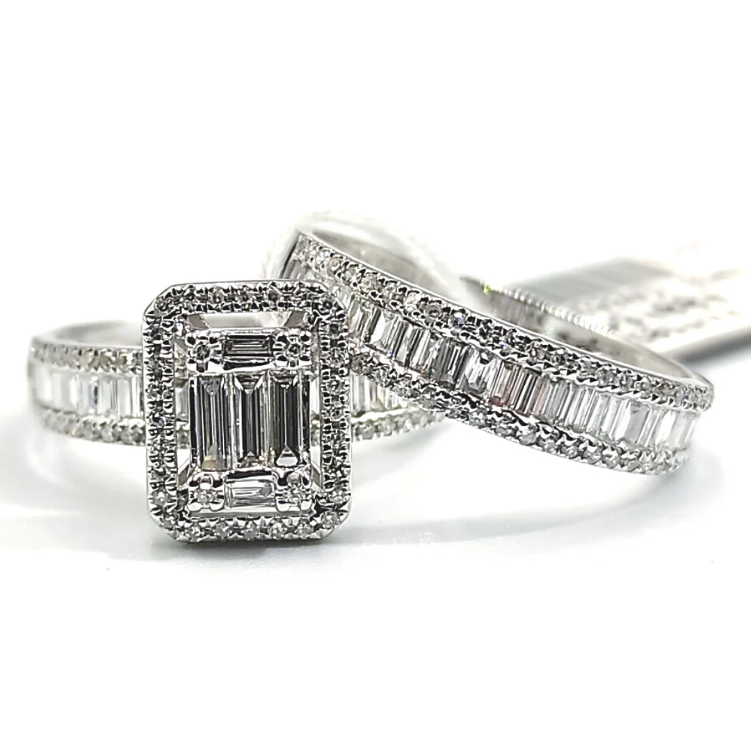 Emerald Illusion Halo Diamond Engagement Ring and Baguette Half Eternity Wedding Ring Bridal Set 14K White Gold