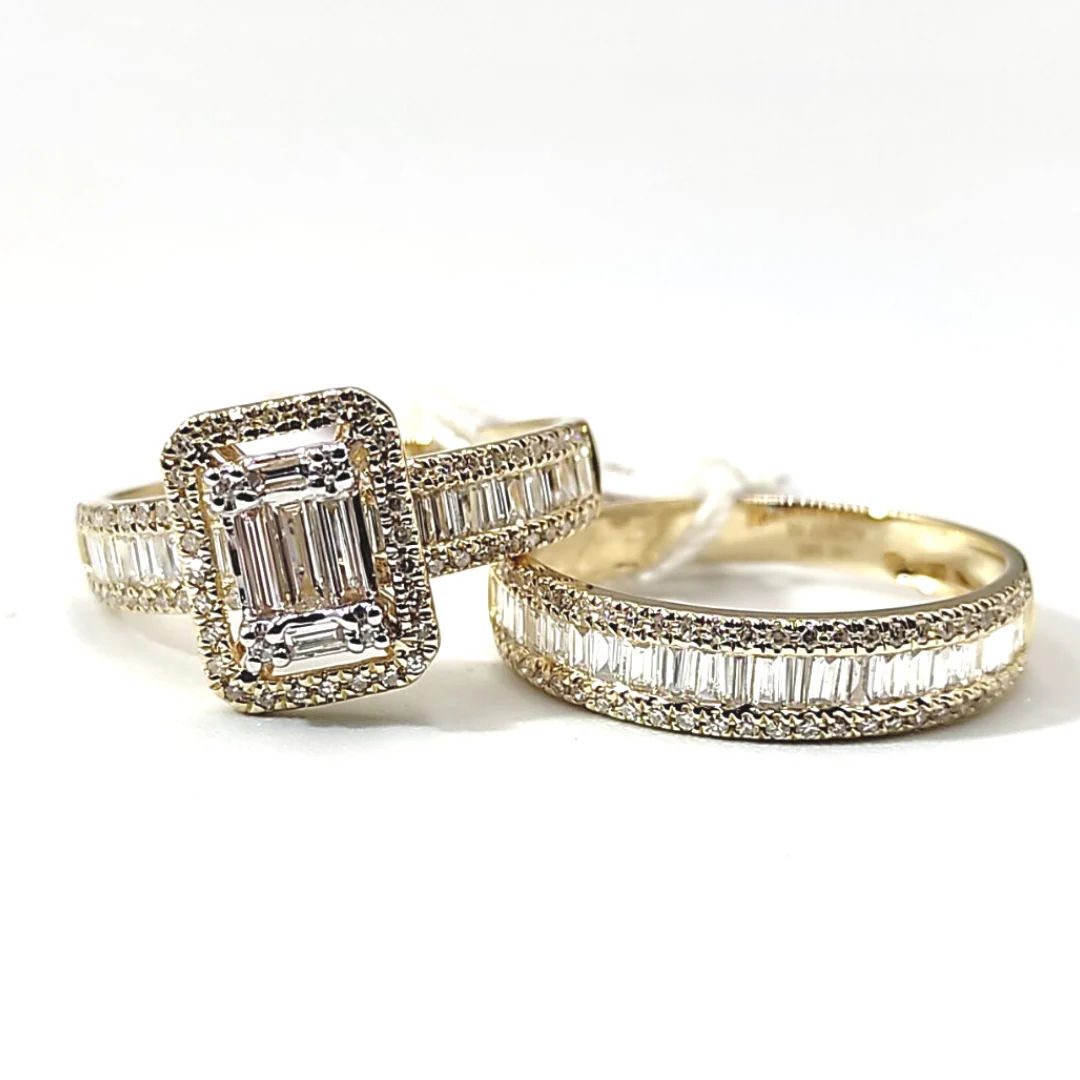 This 14K yellow gold bridal ring set includes one emerald illusion diamond engagement ring and one baguette style half eternity band for a bridal look on your wedding day. The main emerald diamond is approximately 2 carat face giving your finger a big sparkler. The rings also feature accent diamonds on the side to give it extra sparkle and is beautifully finished with a high polish shine.